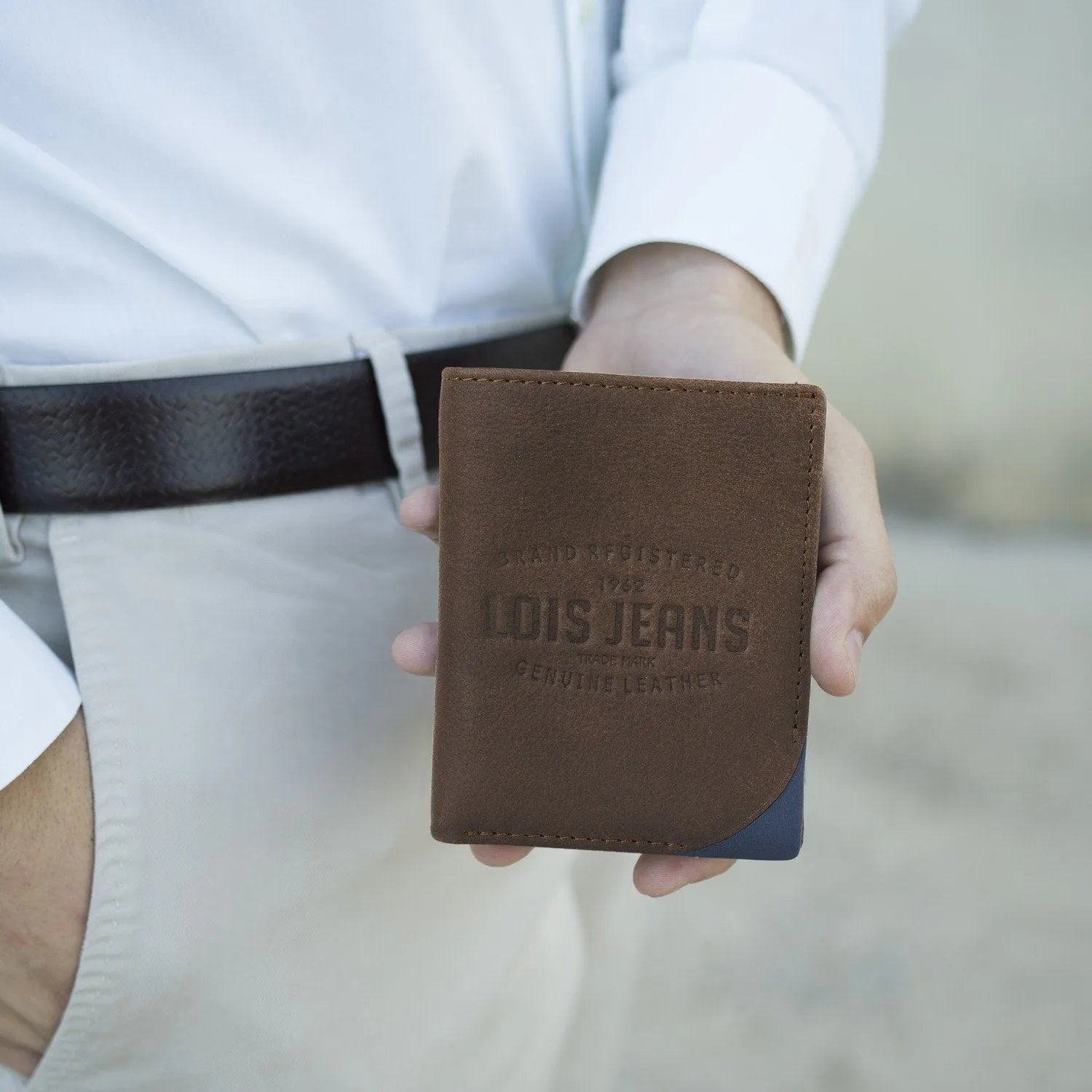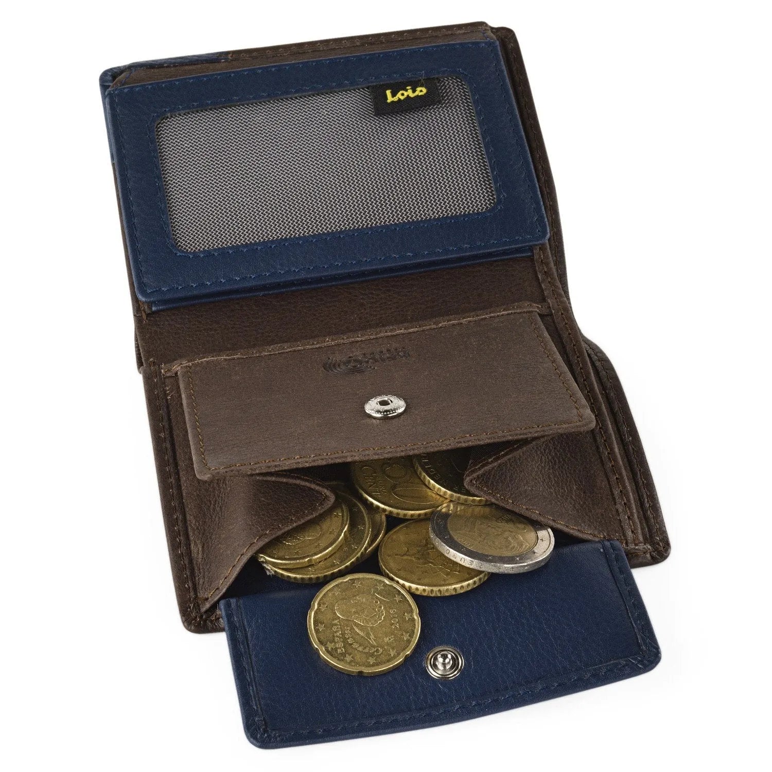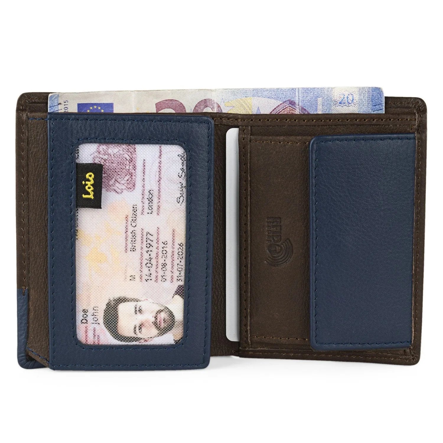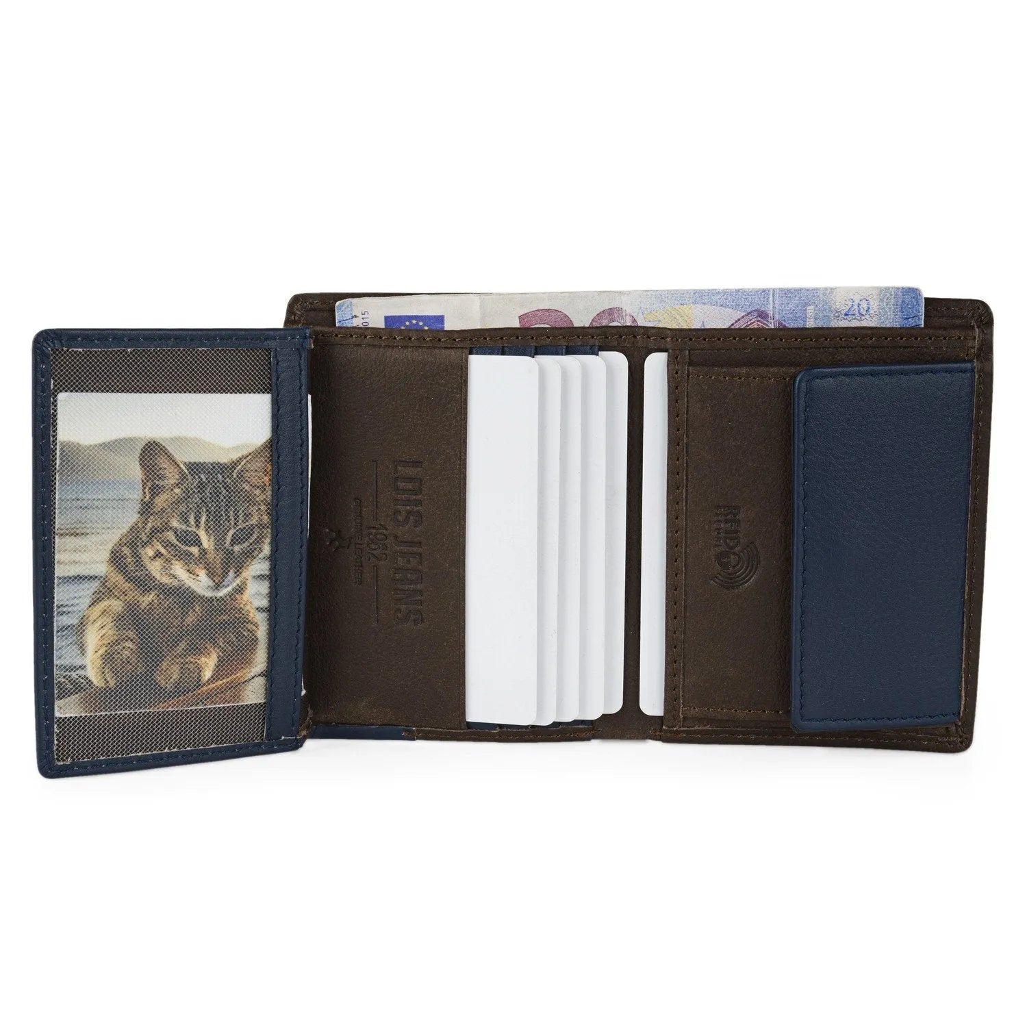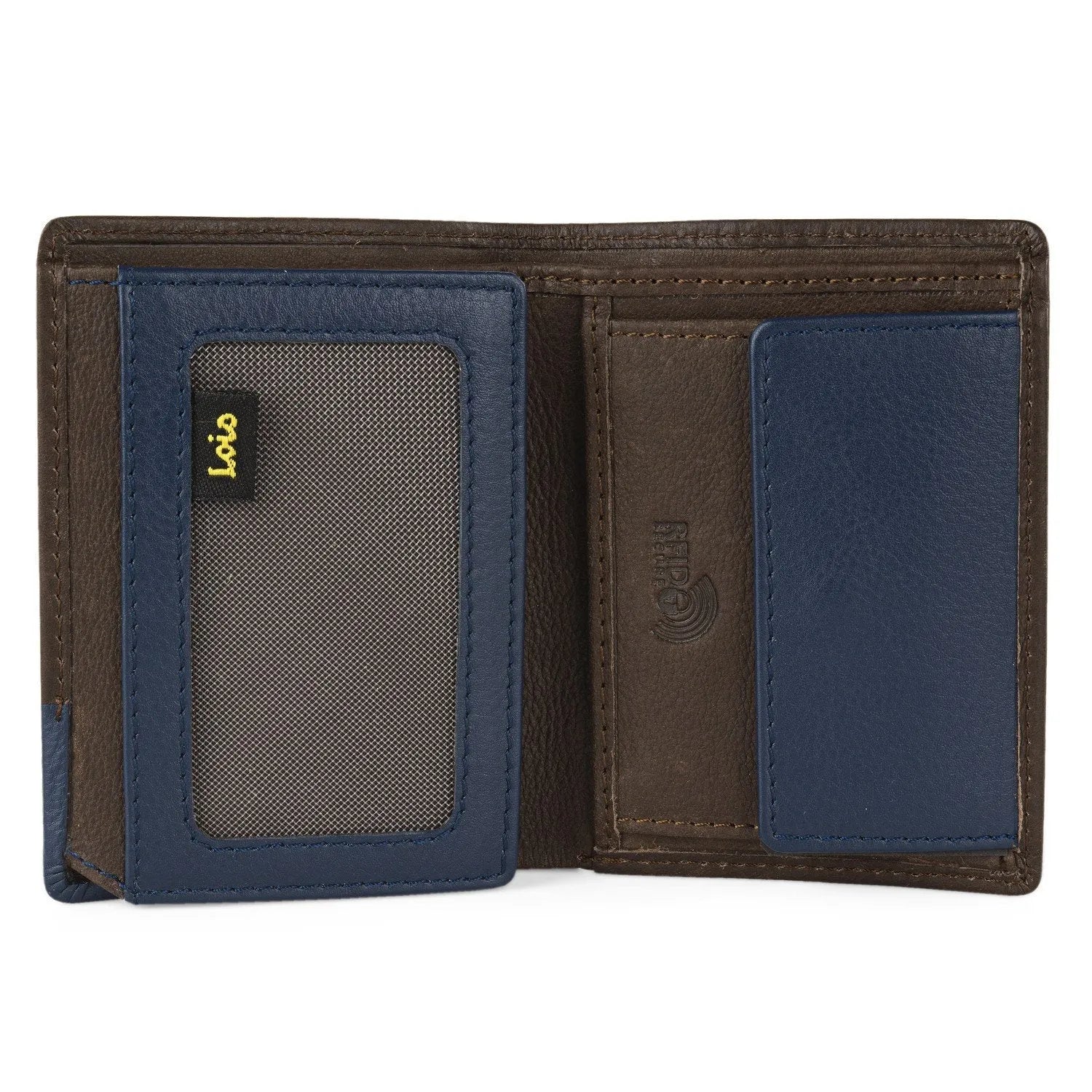 A very complete men's leather wallet with a vertical layout and multiple pockets and compartments. It has space for cards, bills and coins separately. Made of 100% Leather. Includes RFID technology to prevent card theft.