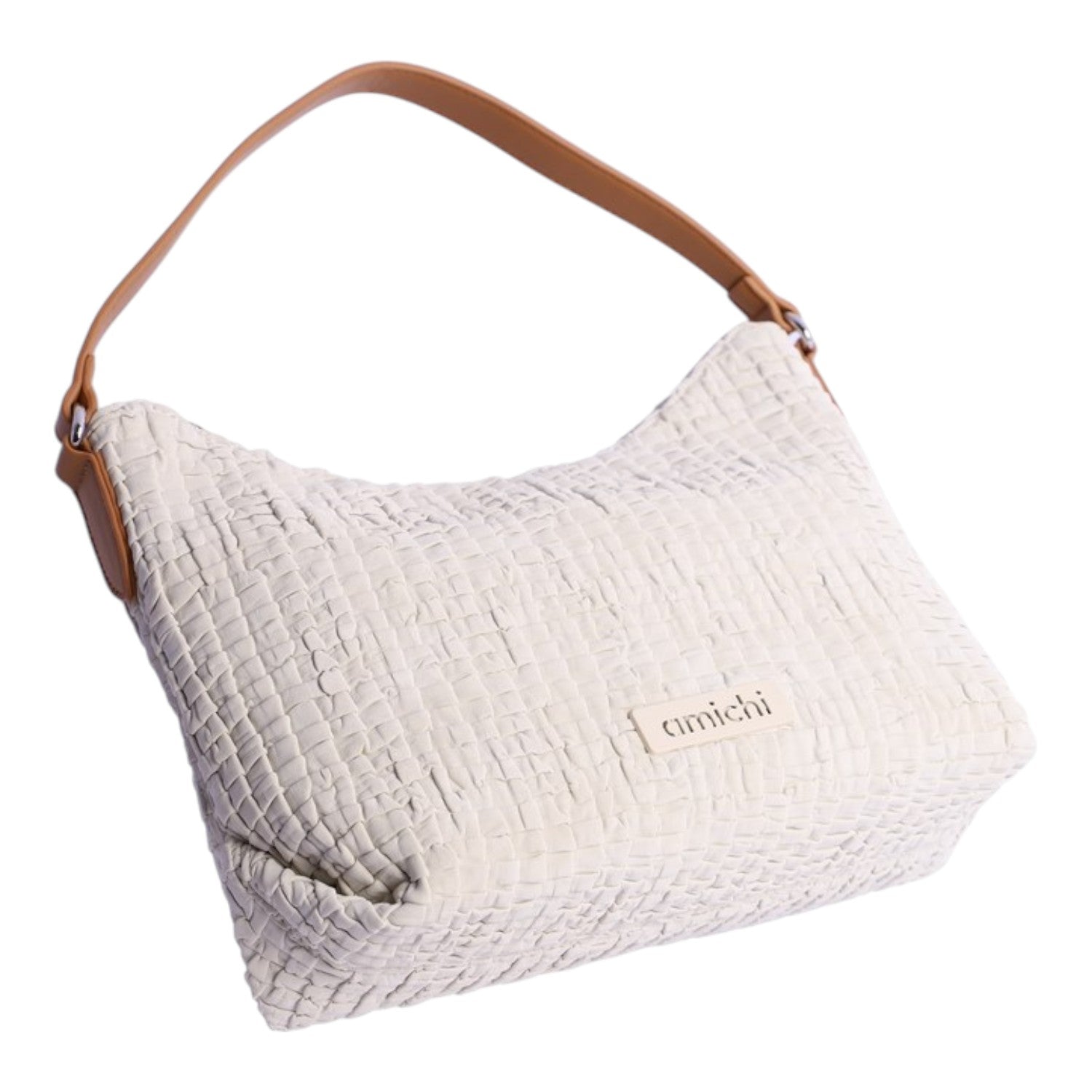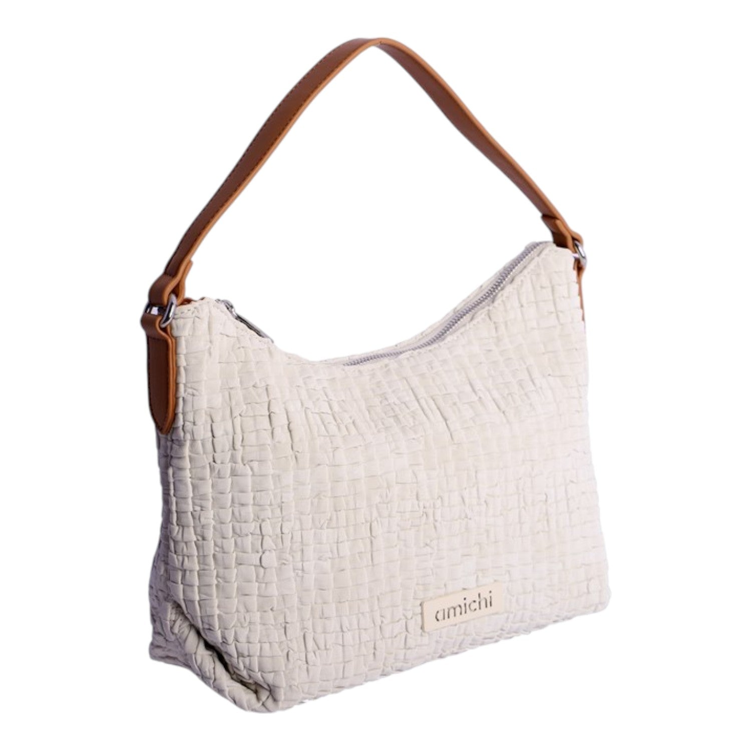Bolso de hombro Amichi con textura en relieve, muy suave y una textura original , lleva asa para llevar de mano o al hombro y cinta adicional para llevar cruzado, cierre de cremallera y detalle del logo en la parte frontal.