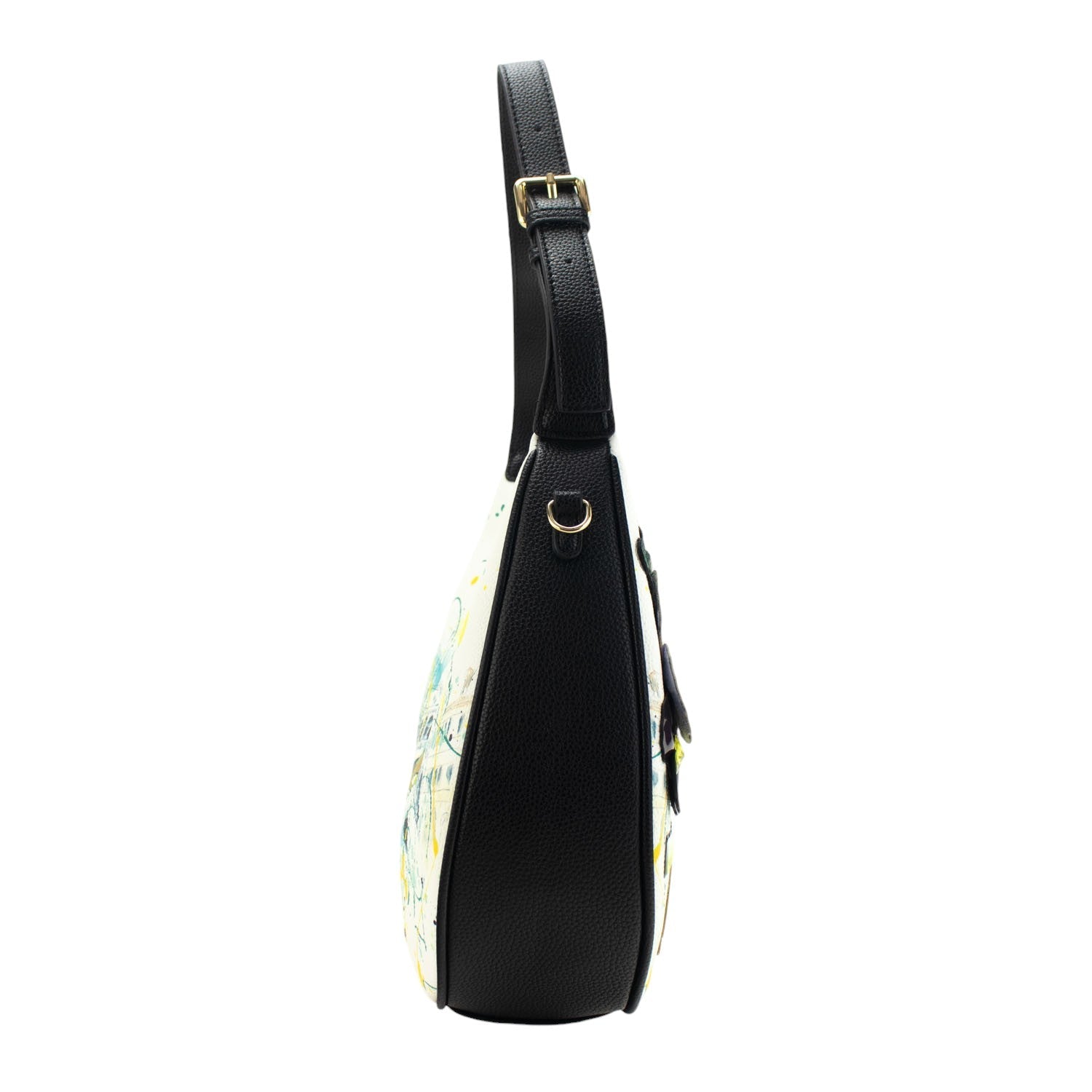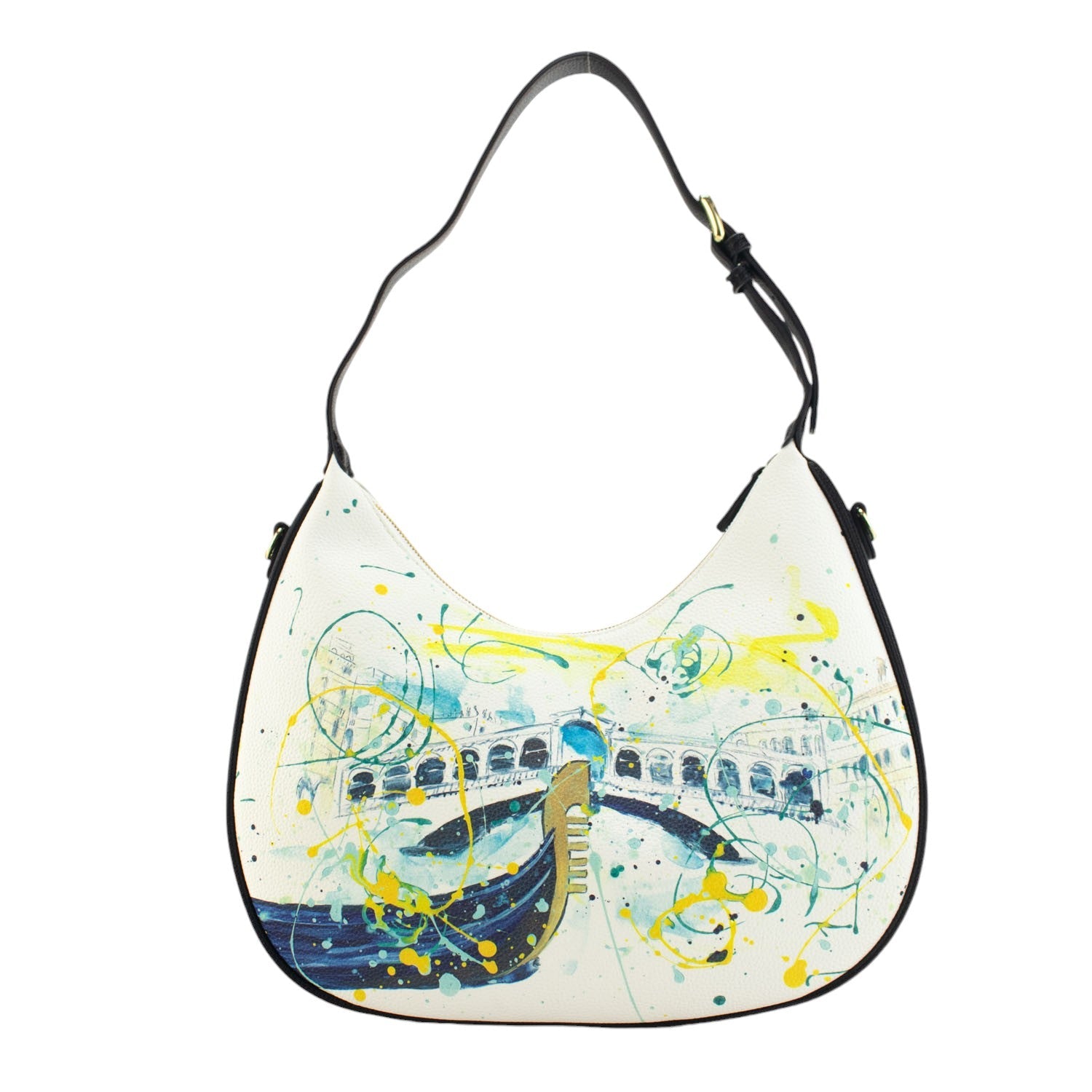 Un bolso de mano con asa de mano y un compartimento interior amplio, con cierre de cremallera. Su exterior es un espectáculo de color que detalla los elementos característicos de la ciudad de Venezia con apliques y brillantes que realzan el diseño al máximo nivel ¡Te enamorará nada más verlo!