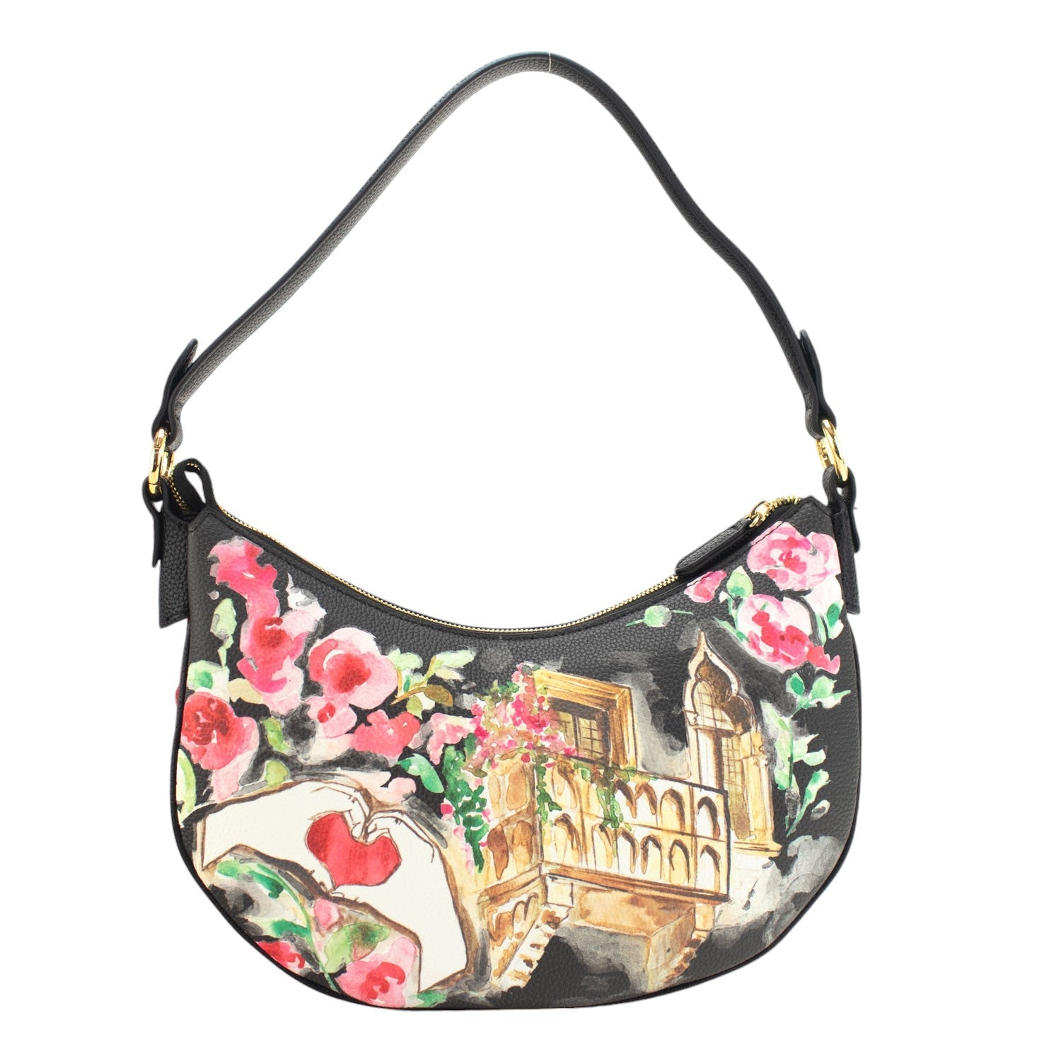 Un bolso de mano con asa de mano y un compartimento interior amplio, con cierre de cremallera. Su exterior es un espectáculo de color que detalla los elementos característicos de la ciudad de Verona con apliques y brillantes que realzan el diseño al máximo nivel ¡Te enamorará nada más verlo!
