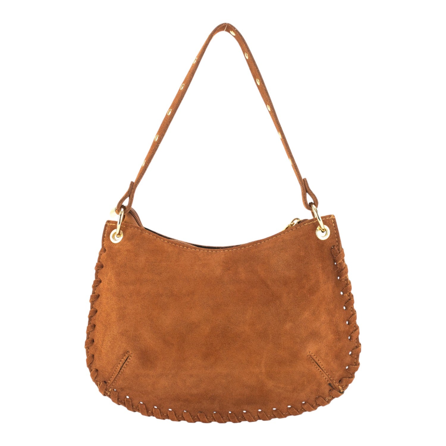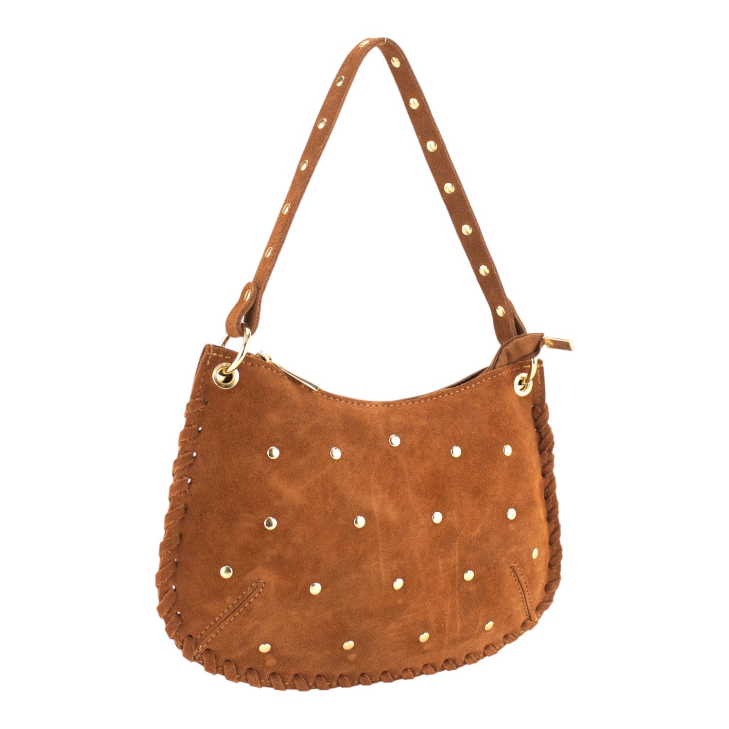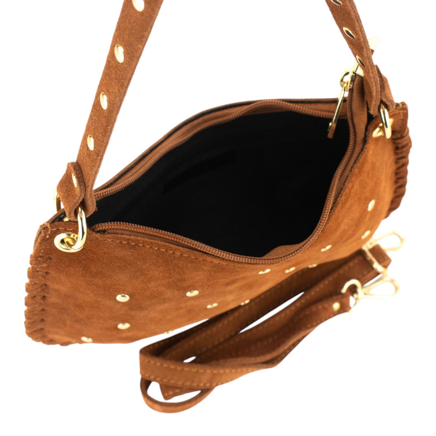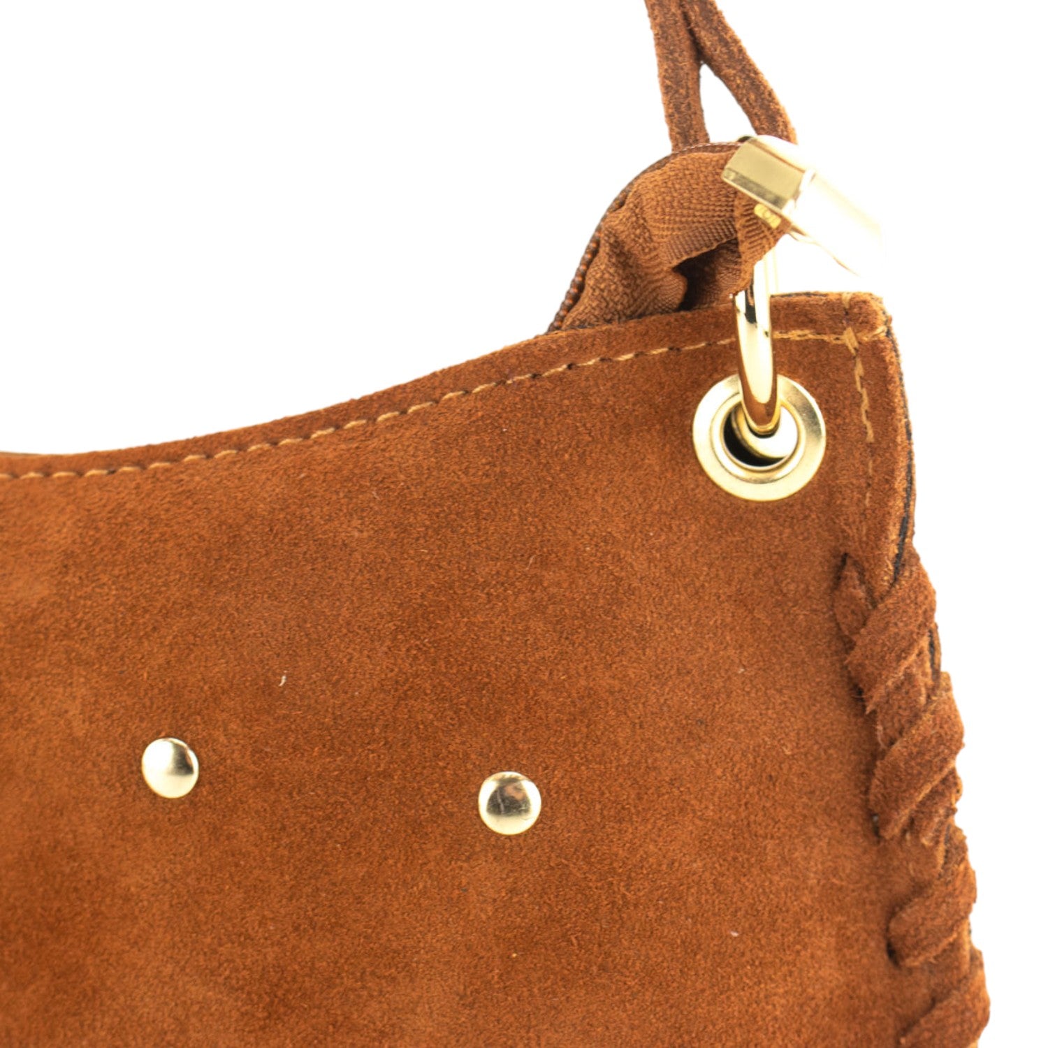 Combina tu look diario con la Bandolera en piel Pregato Luminia, un bolso de hombro con mucho estilo y personalidad. Confeccionado en piel vacuno 100% tipo pregato, destaca por su tacto suave y su acabado ligeramente afelpado. El diseño se realza con aplicaciones metálicas doradas en el frontal y un elegante detalle de costura trenzada en el contorno, que le aportan un aire moderno y sofisticado.