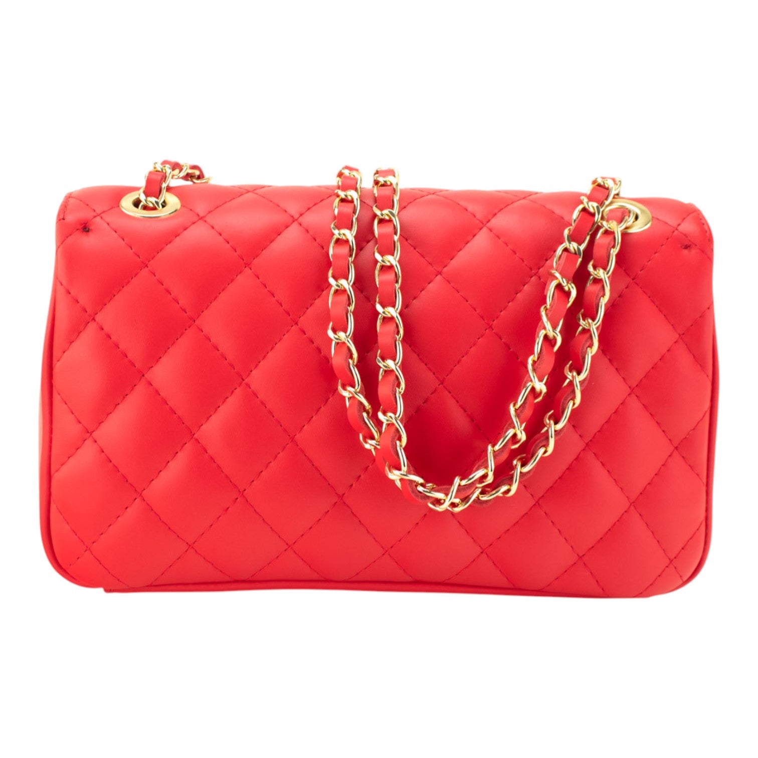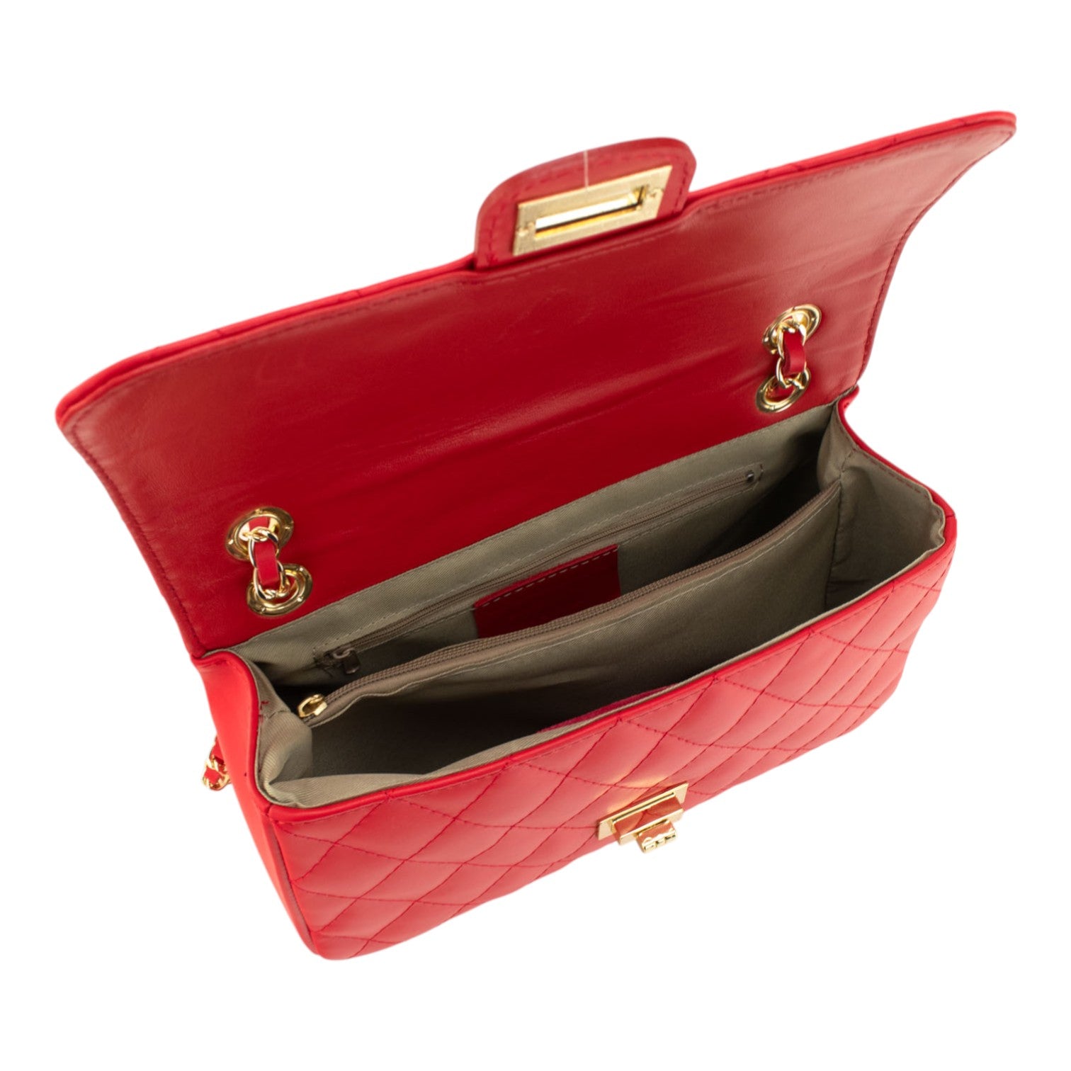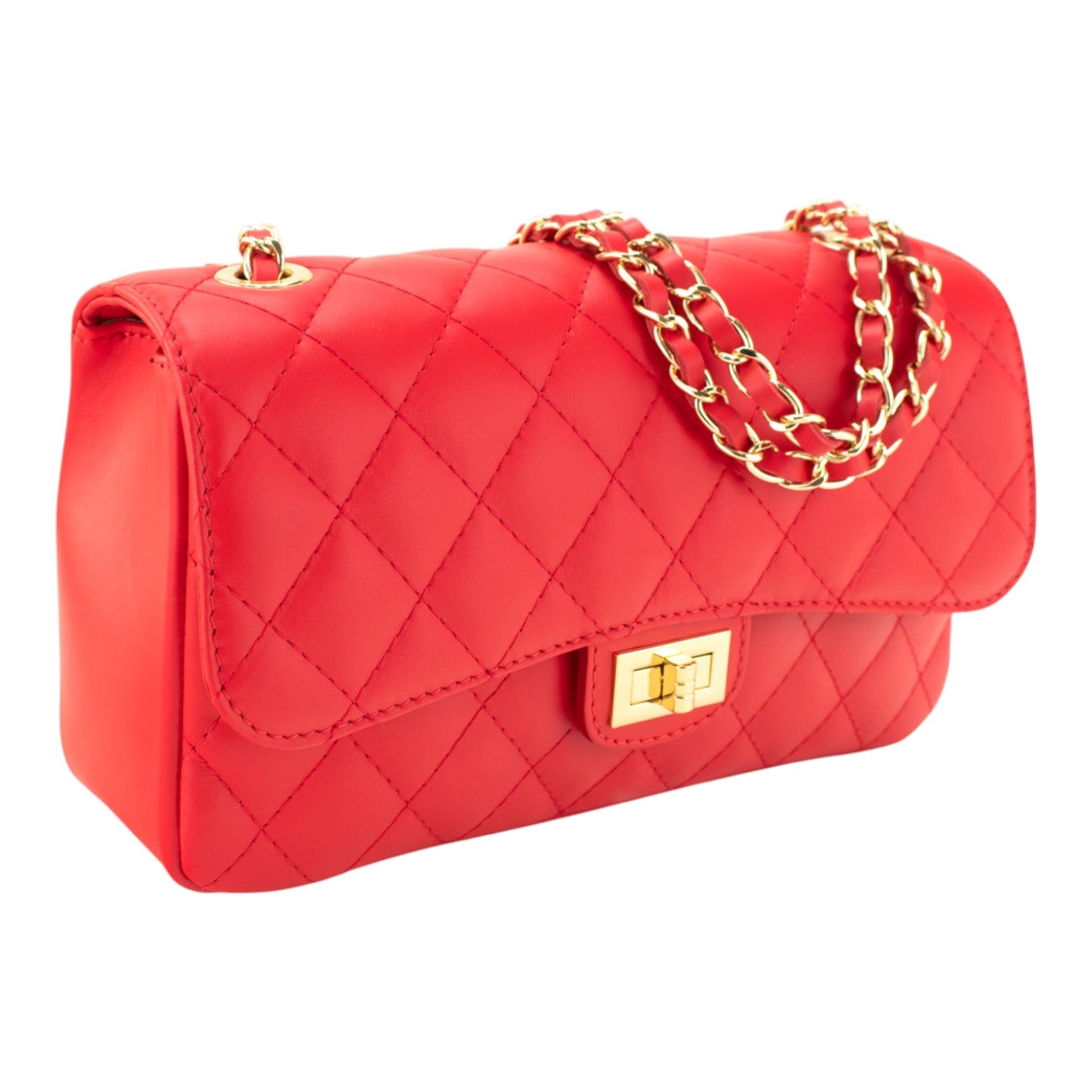 Un bolso super original para lucir a diario, realizado en Piel 100% genuina vacuno italiana, este bolso está hecho en Italia con una excelente manufactura y calidad, tiene un cierre broche metalizado en tono dorado muy original, con una preciosa cinta de cadena en tonos dorados para llevar cruzado o al hombro.