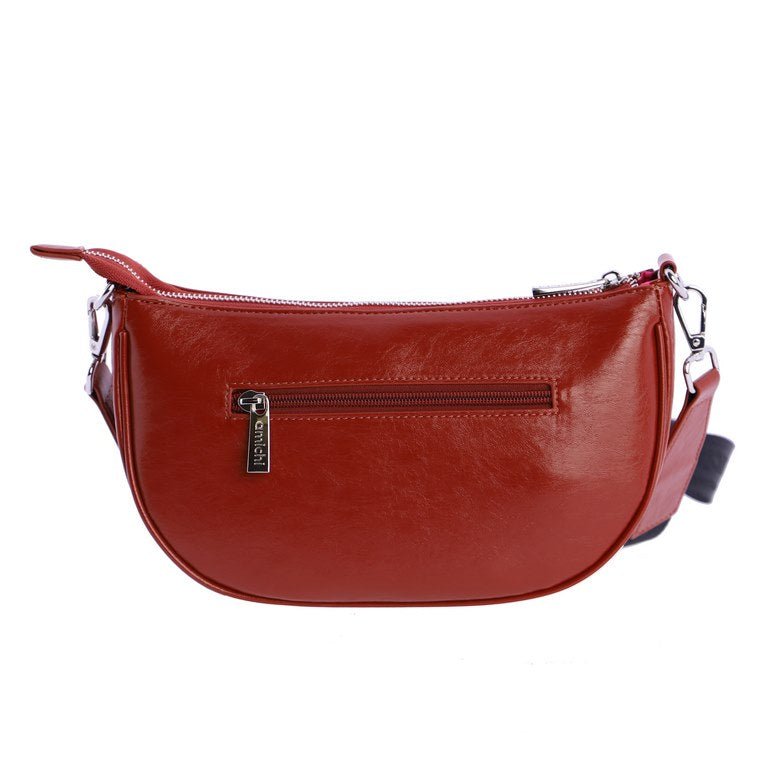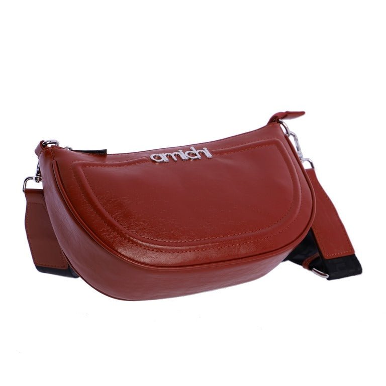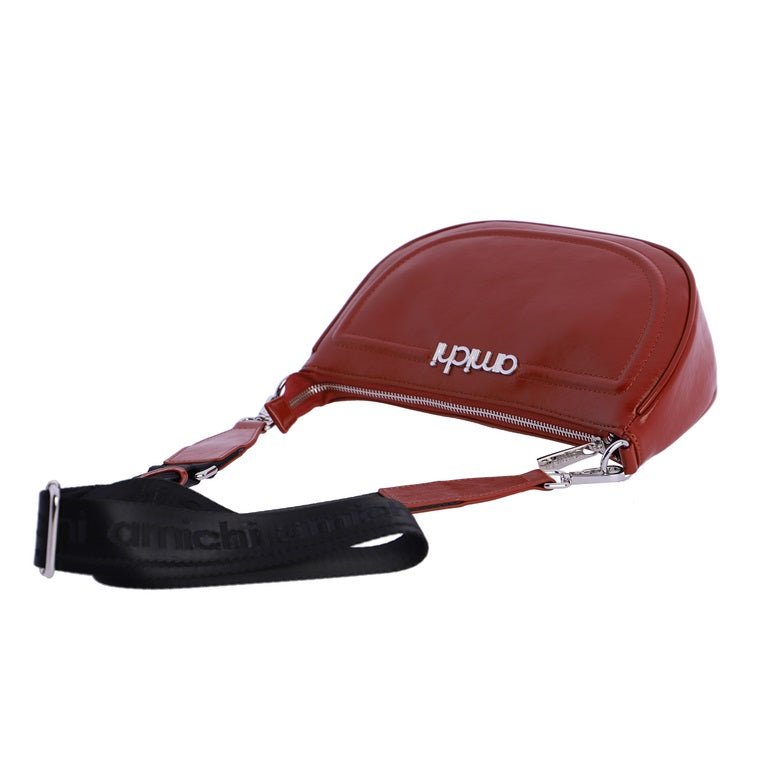 Bandolera Amichi de tamaño compacto, con cierre de cremallera, detalle del logo en la parte frontal, en efecto brillo