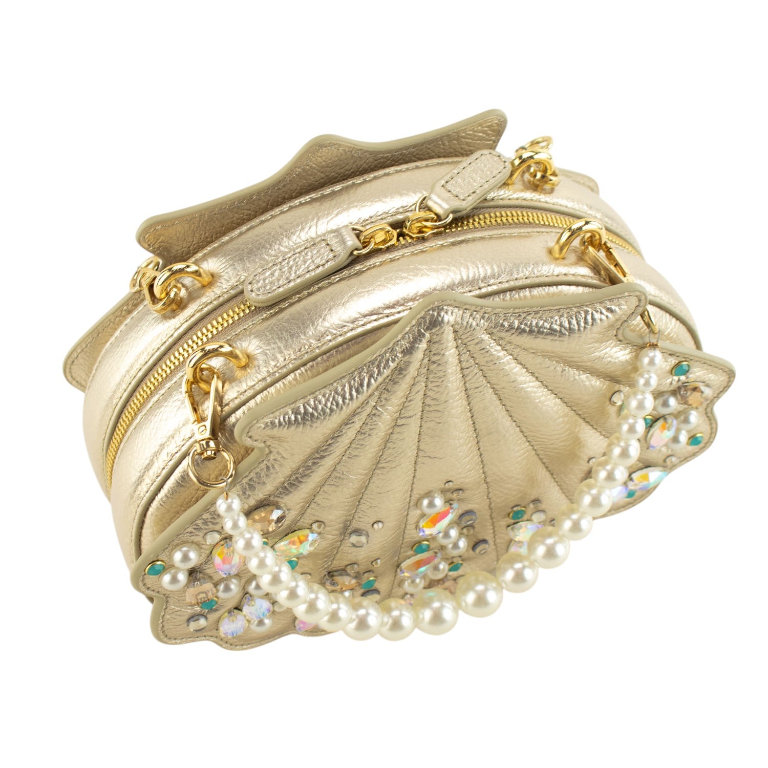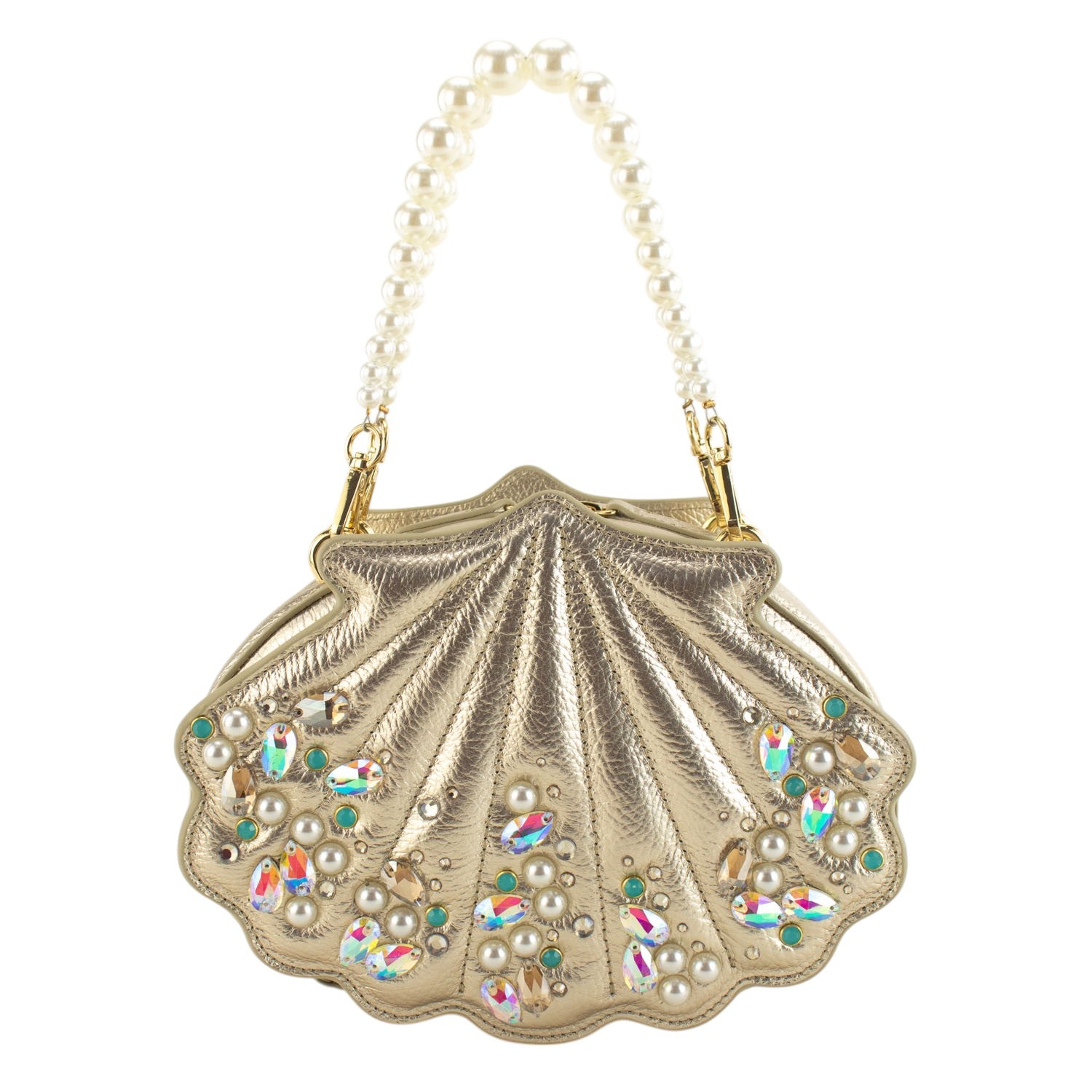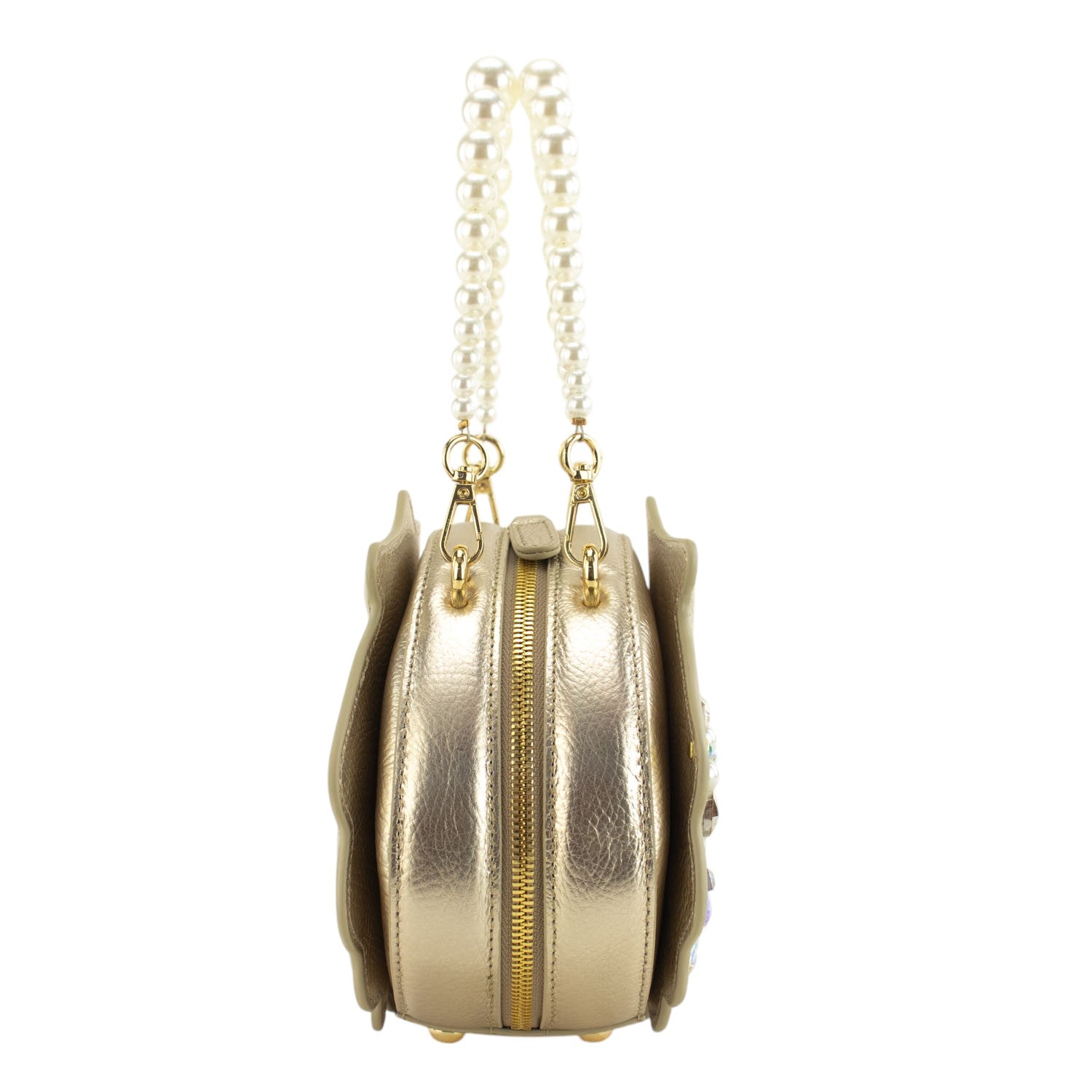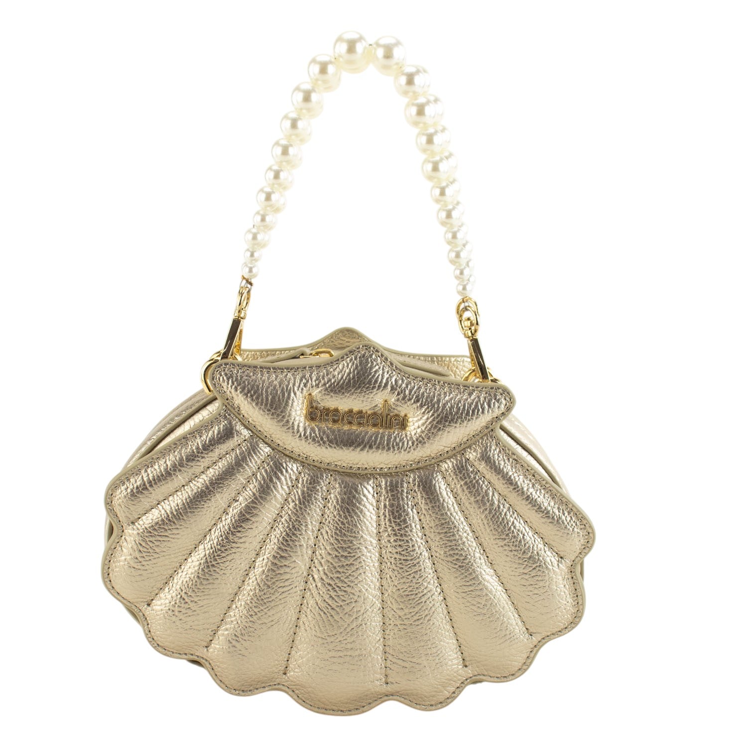 Braccialini sorprende con este espectacular Bolso de mano en forma de concha, con asas con perlas y detalle de pedrería, este modelo en piel 100% será el toque perfecto en cualquier evento que tengas, con cierre de cremallera y cinta en cadena ideal para llevar al hombro