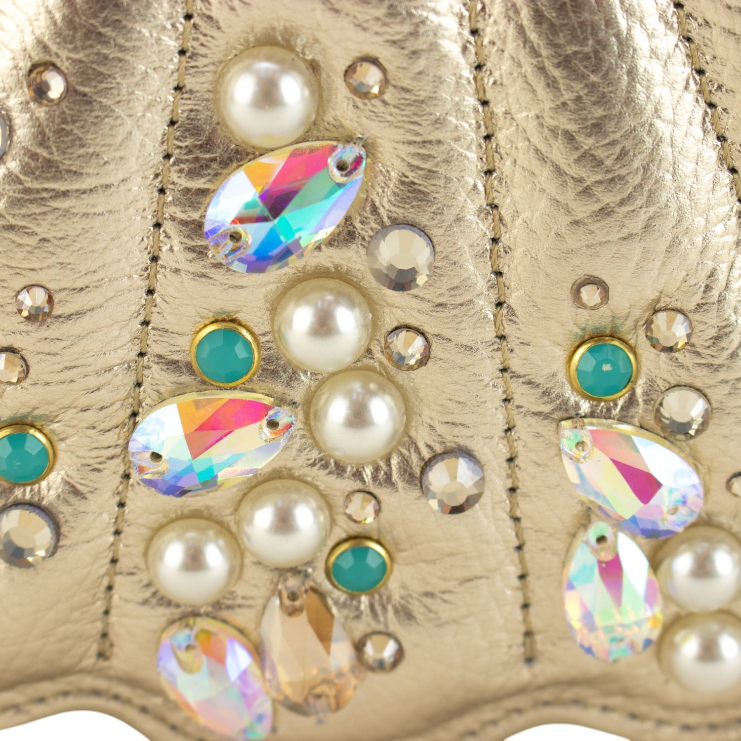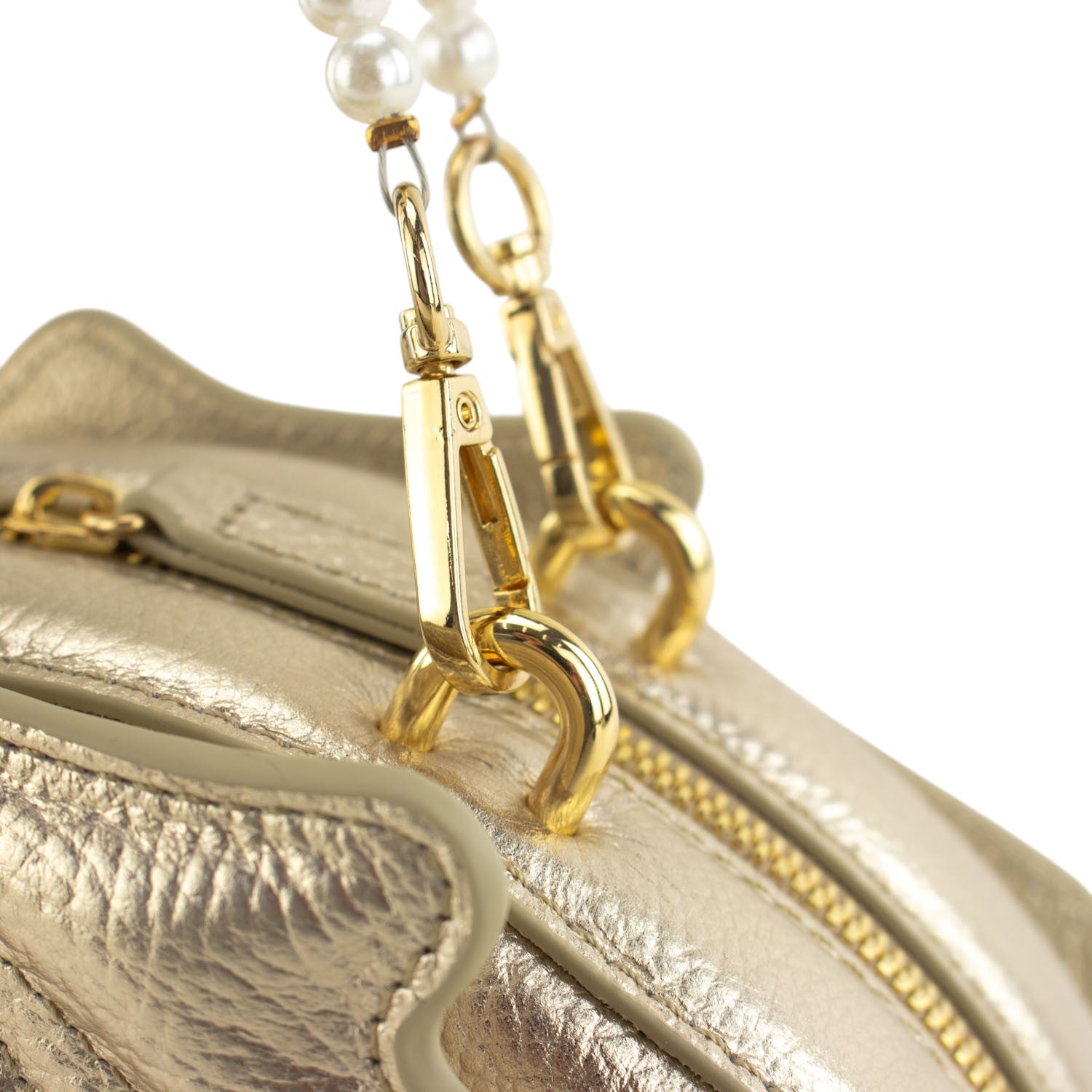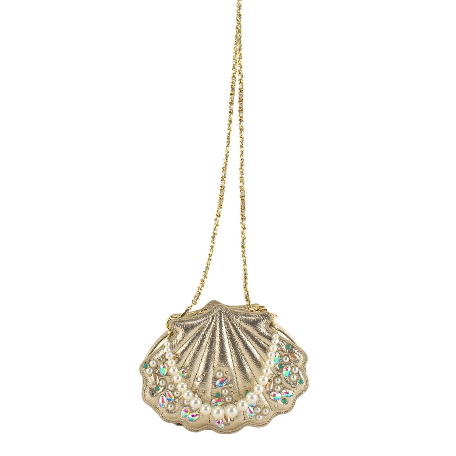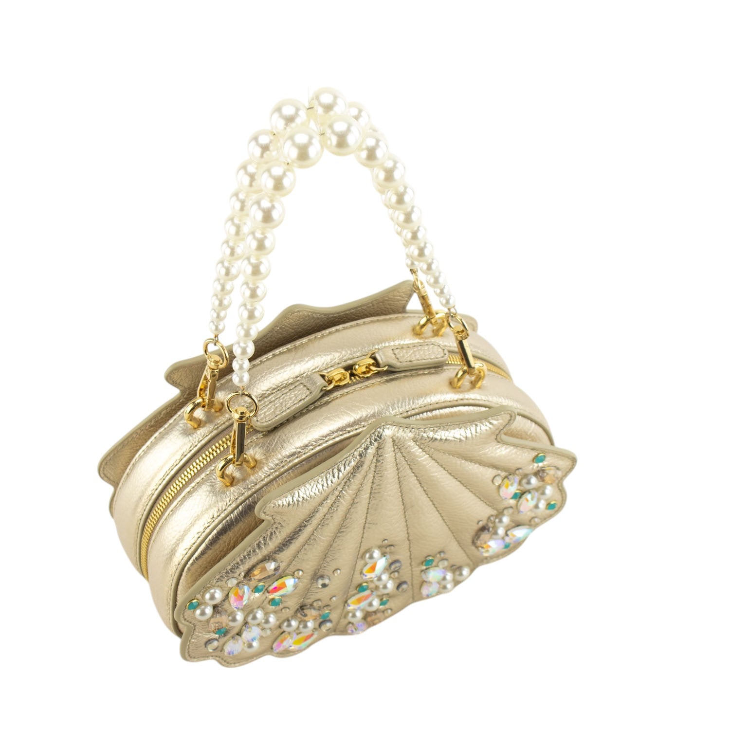 Braccialini sorprende con este espectacular Bolso de mano en forma de concha, con asas con perlas y detalle de pedrería, este modelo en piel 100% será el toque perfecto en cualquier evento que tengas, con cierre de cremallera y cinta en cadena ideal para llevar al hombro