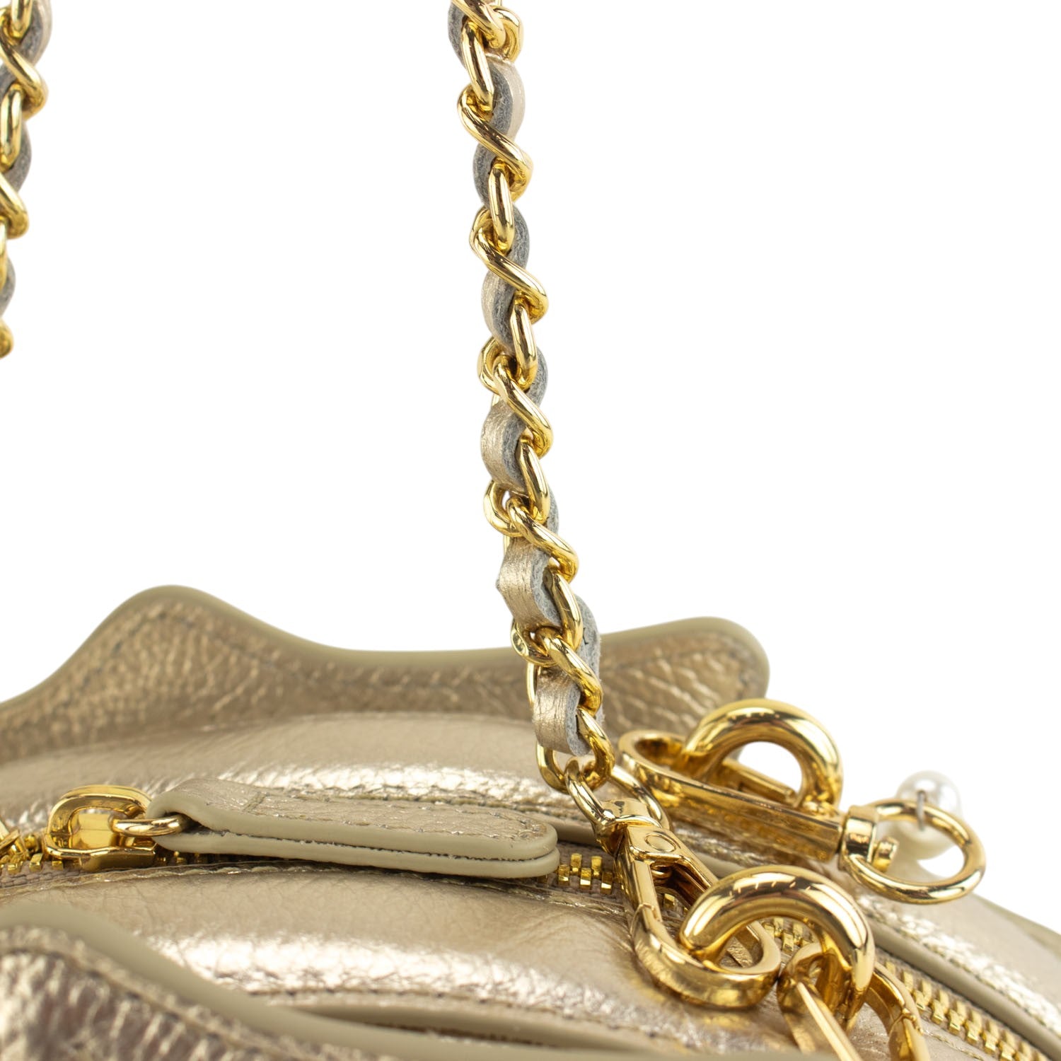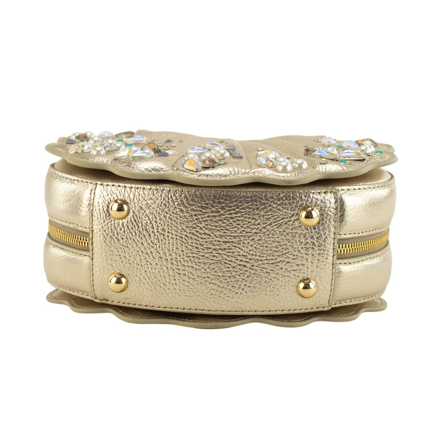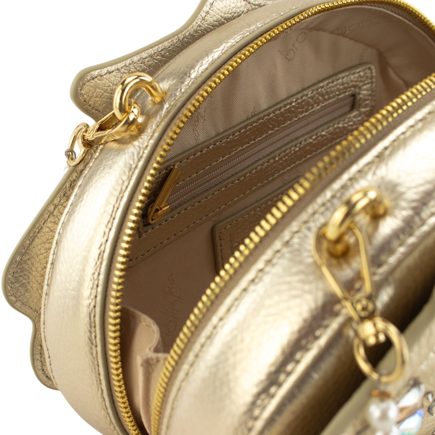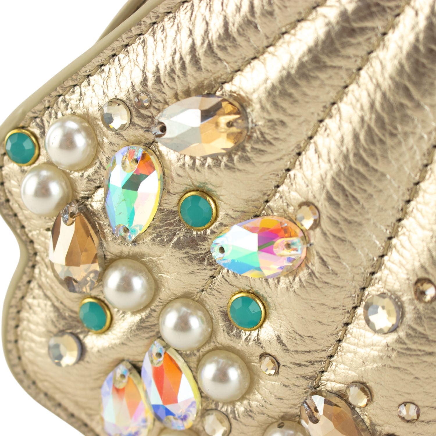Braccialini sorprende con este espectacular Bolso de mano en forma de concha, con asas con perlas y detalle de pedrería, este modelo en piel 100% será el toque perfecto en cualquier evento que tengas, con cierre de cremallera y cinta en cadena ideal para llevar al hombro